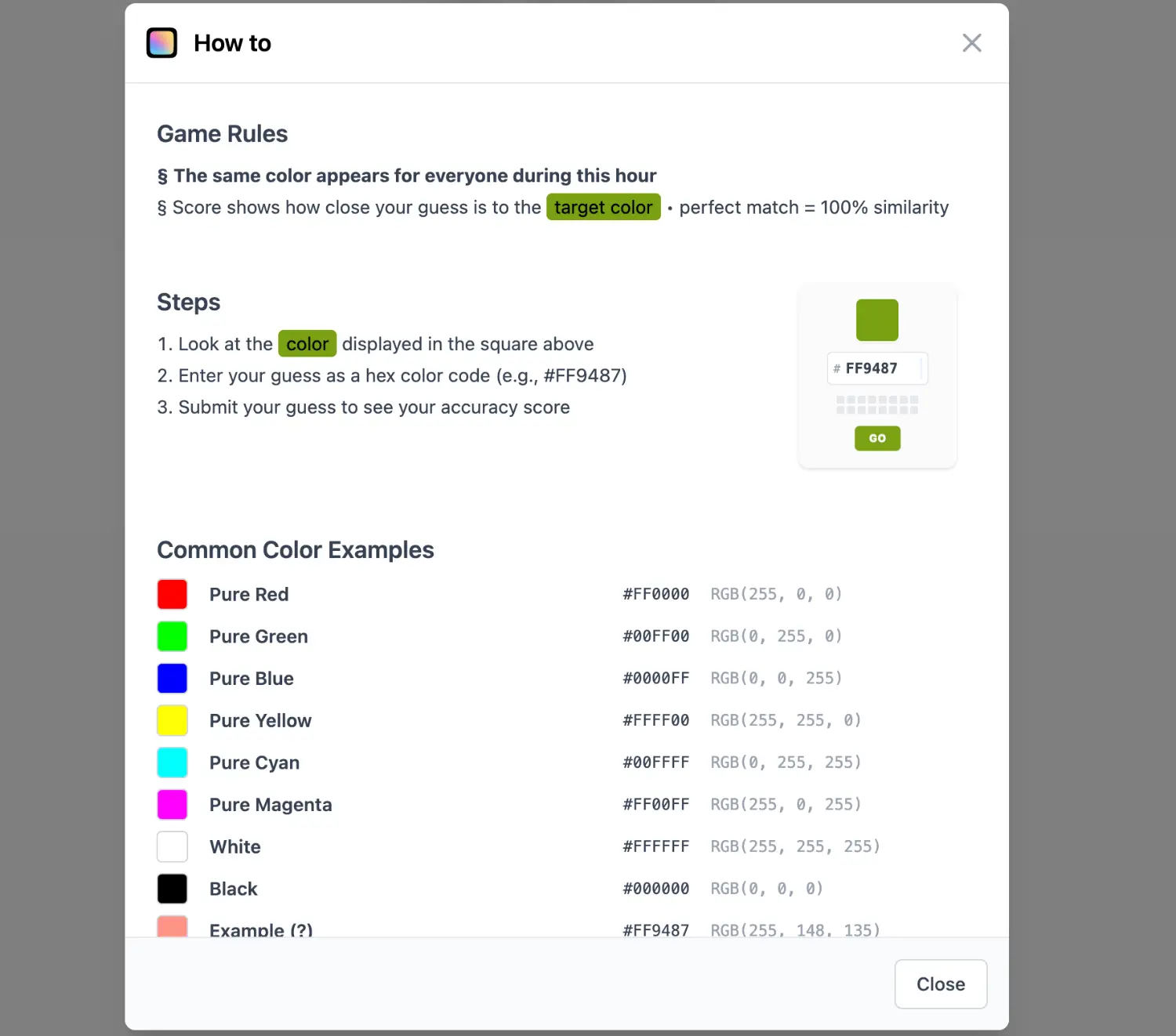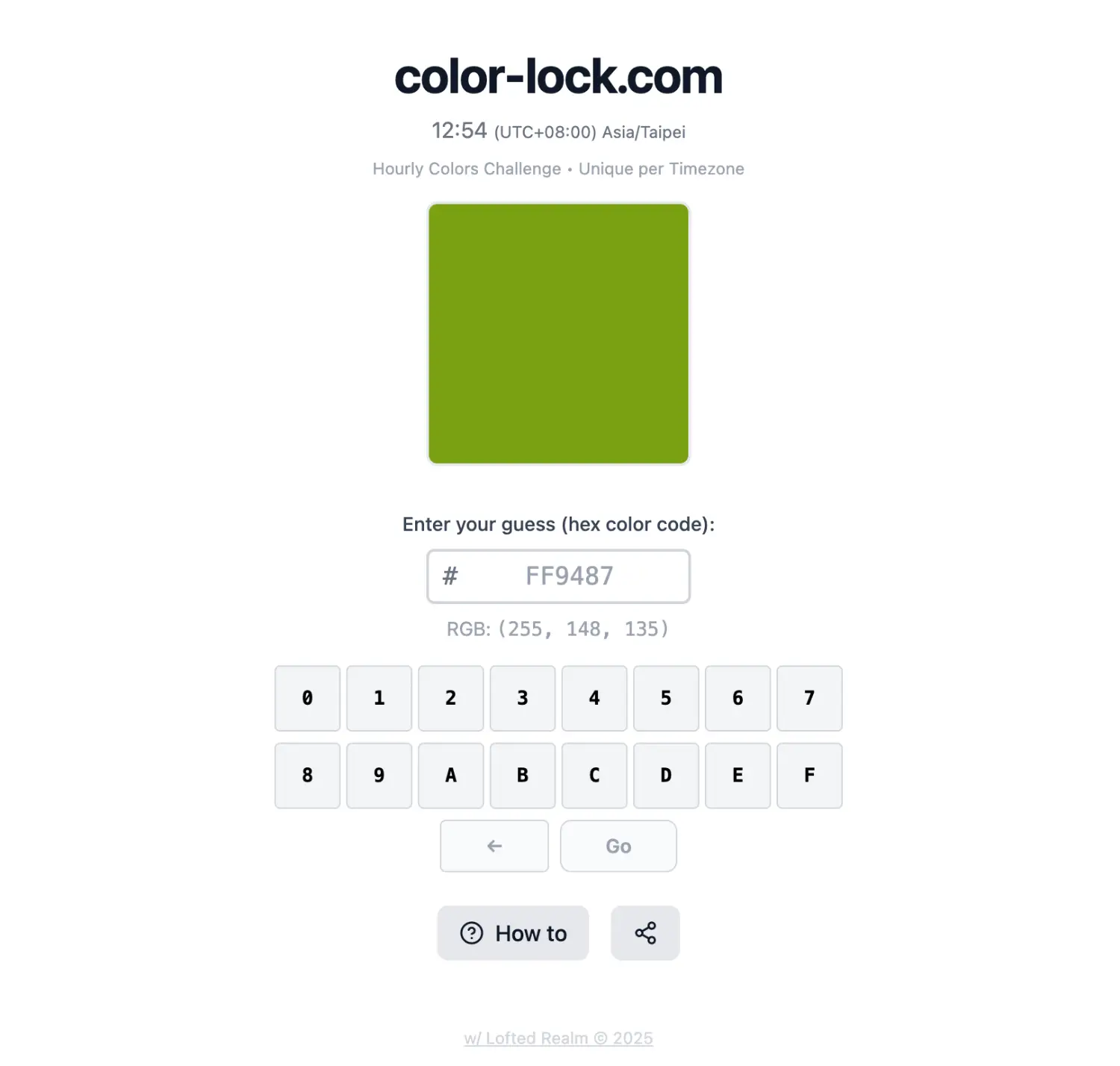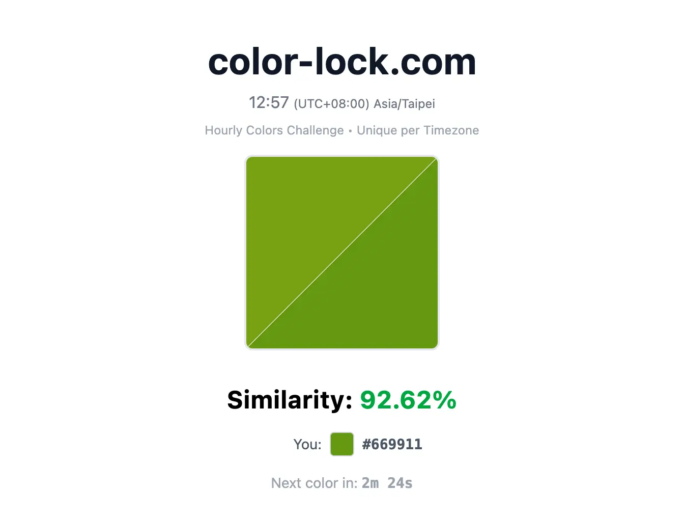 Color Lock Challenge is a simple color perception game where you guess exact hex color codes. One shared color challenge appears every hour, helping users practice RGB and hex color understanding.